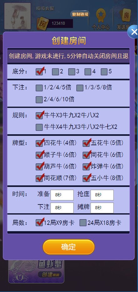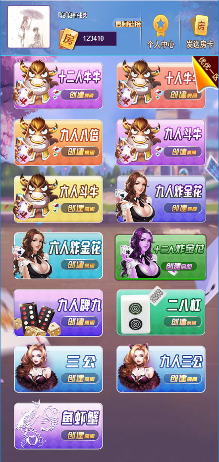 十二人牛牛、十人牛牛、九人八倍、九人斗牛、六人斗牛、九人炸金花、六人炸金花、十二人炸金花、九人牌九、二八杠、三公、九人三公、鱼虾蟹
