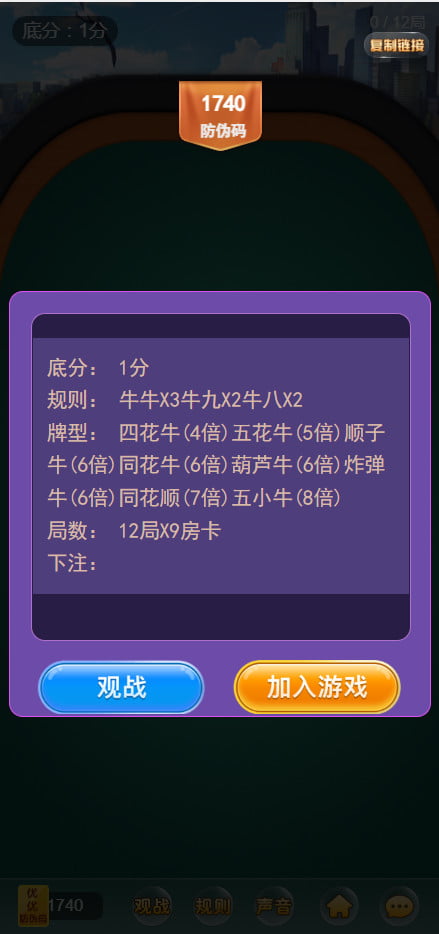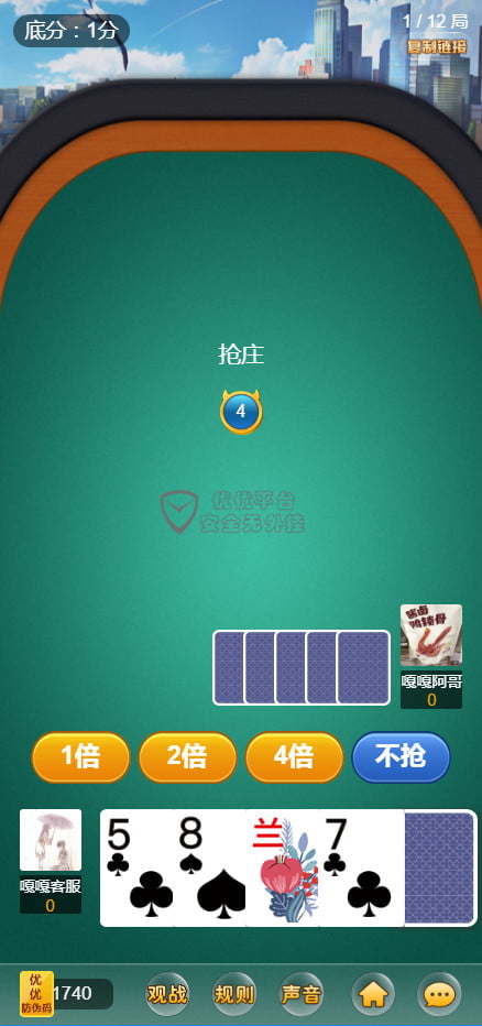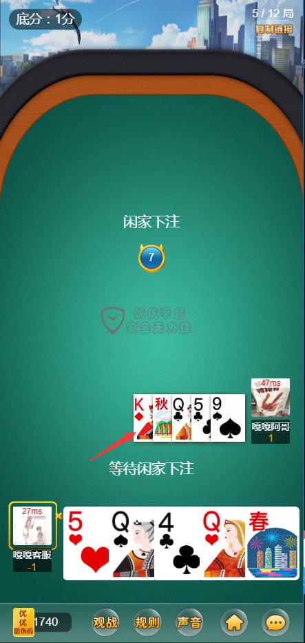 很少有神兽版本有12人金花,这款优优互娱有12人金花,带观战系统,牌局结算以后详细对局信息。