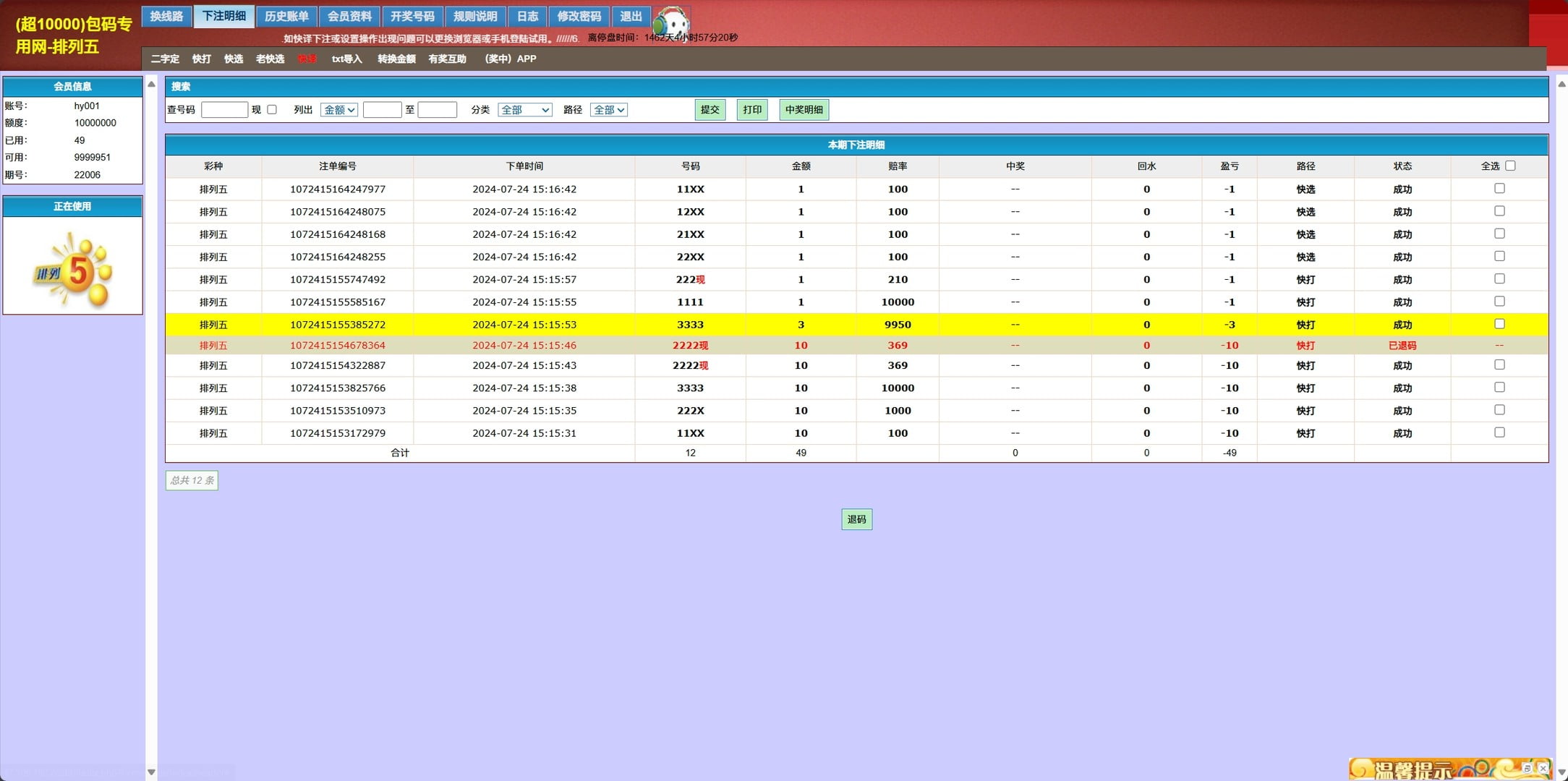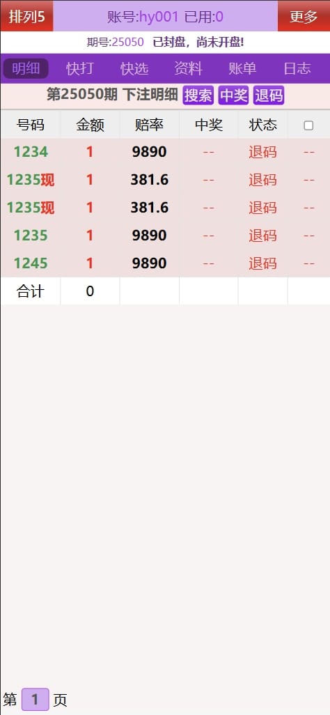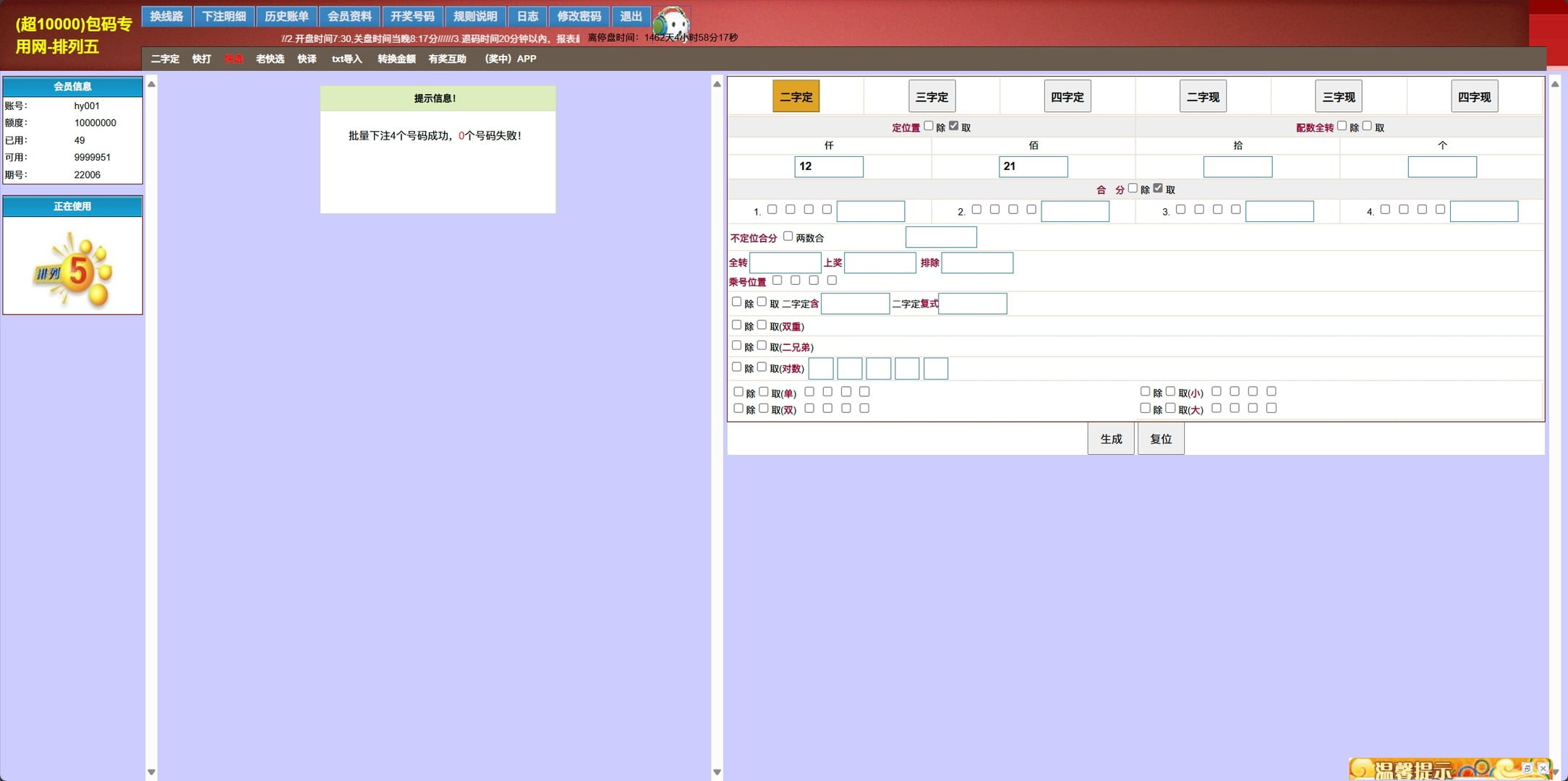 海南七星彩排列五传统打奖系统演示图: